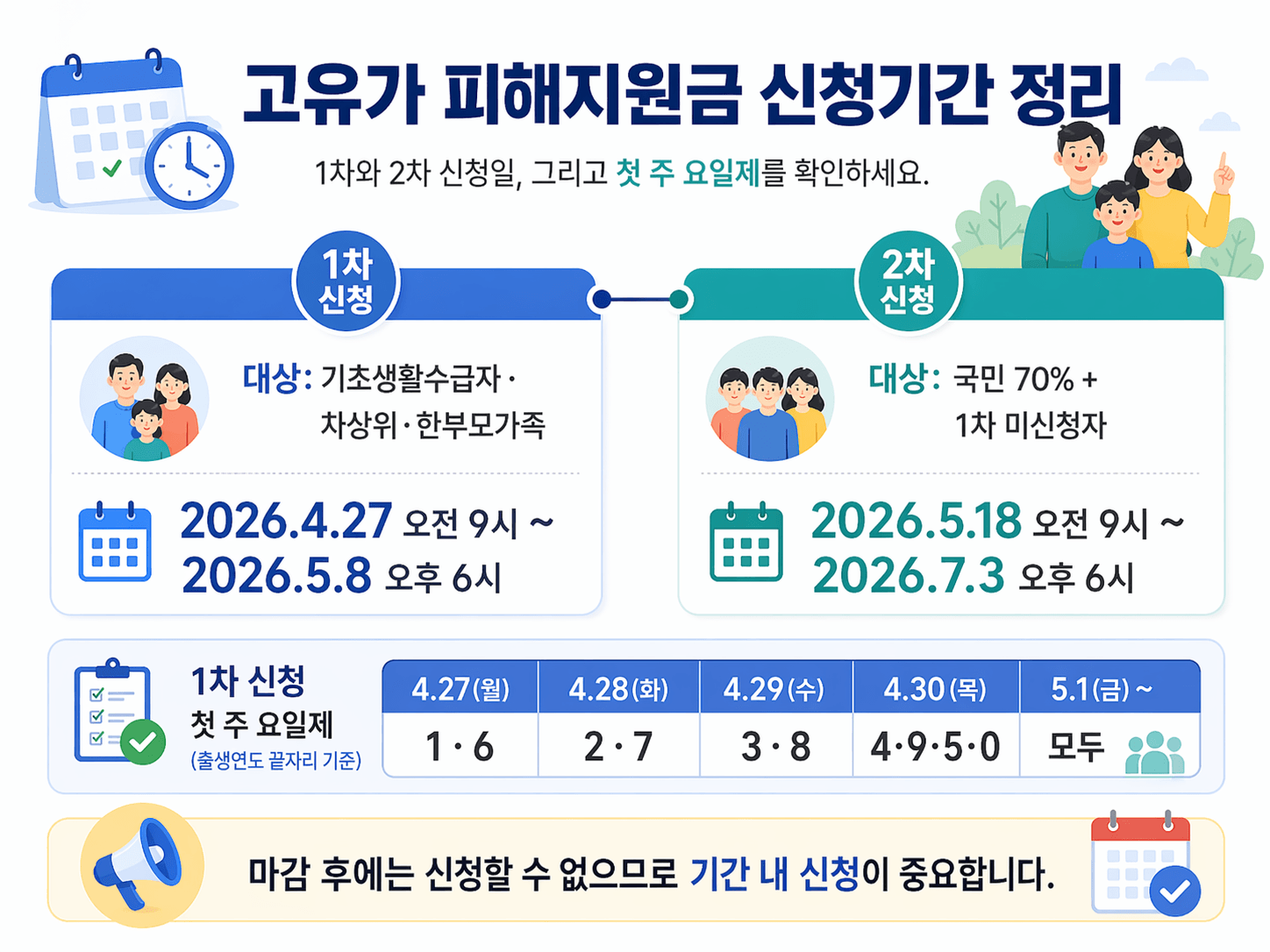 1차 신청기간은 2026년 4월 27일 오전 9시부터 2026년 5월 8일 오후 6시까지다. 신청 첫 주에는 혼잡을 줄이기 위해 출생연도 끝자리 기준 요일제가 적용된다.