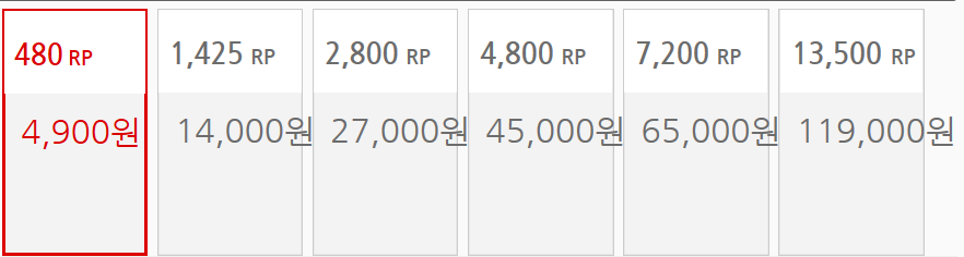 딱 내가 살려는 rp만큼 구입을 하기는 어렵고 그러다보니 1RP 가격을 따져서 RP 가성비를 찾아보게 됩니다.