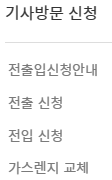 기사가 방문을 해야 하는 경우 예를 들면 이사를 가거나 새로 이사가 들어 왔을 때는 요금조회/신청 -> 기사방문 신청 -> 전출입신청안내 부분을 확인해 보시면 됩니다.