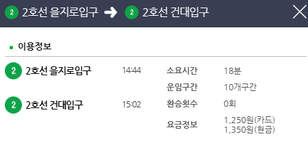 예를 들어 을지로 입구에서 건대입구로 갈려면 총 소요시간은 얼만큼 걸리는지 운임구간이나 환승은 몇번을 해야 하며 요금은 어떻게 되는지 간략하게 확인을 하실 수 있습니다.