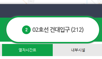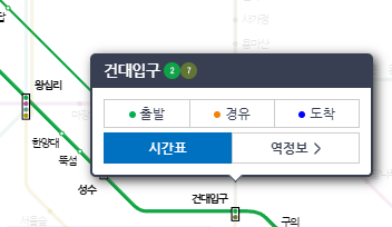 예를 들어 성수역에서 출발하는 열차가 건대역에는 몇시에 도착을 하는지 보실려면 건대입구역 선택 -> 에 보시면 내선이나 외선 중에 분으로 표기되어 있는 부분을 눌러보시면 됩니다.
