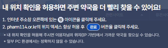 내 위치 액세스 허용을 하시면 현위치를 기반으로 가장 가까운 약국을 알려주기 대문에 일요일이나 공휴일, 토요일에 열려있는 약국을 빠르게 찾기 편리합니다.